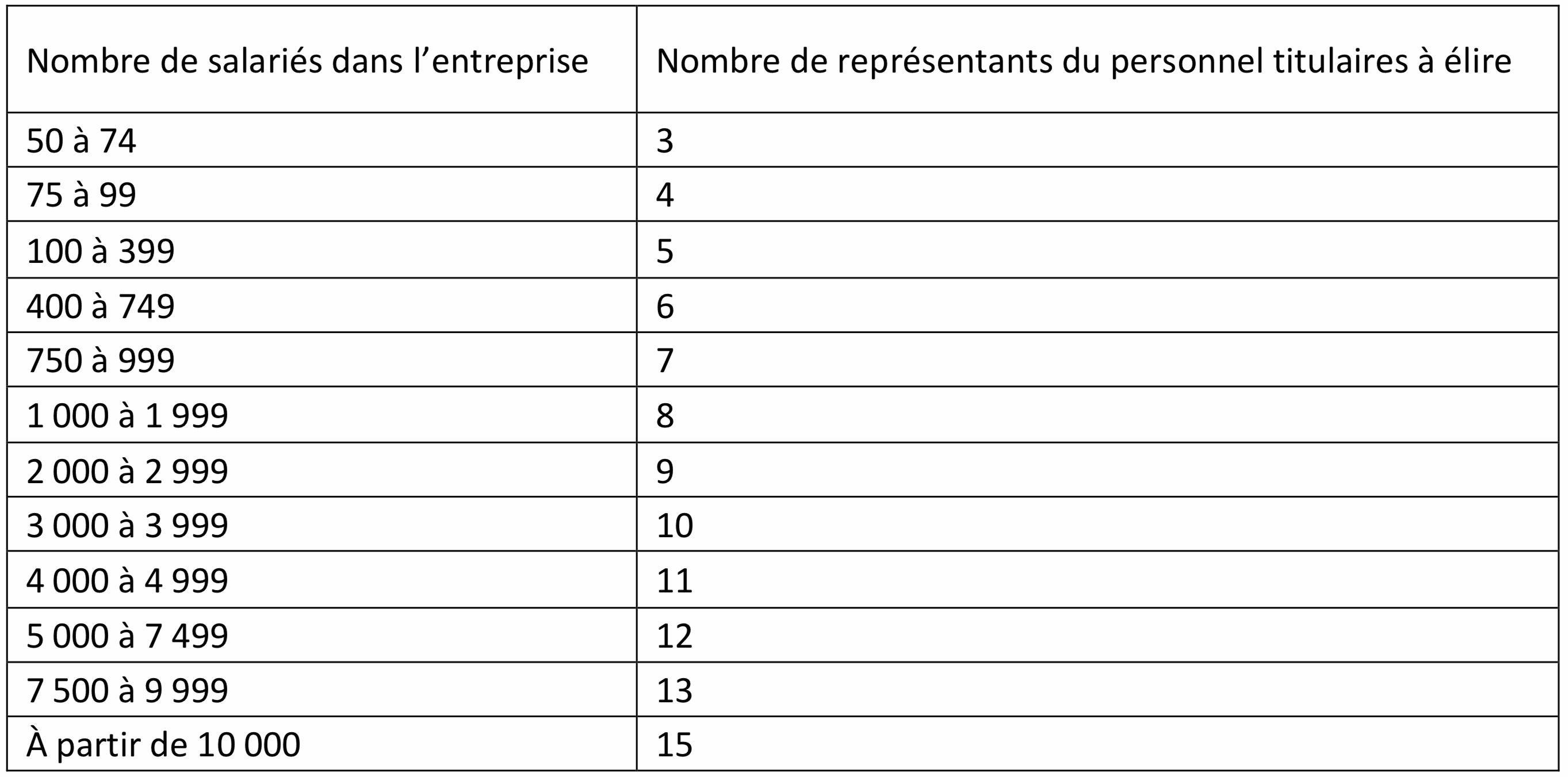 Le tableau ci-dessous récapitule le nombre de représentants en fonction de l’effectif de l’entreprise.
