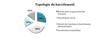 HOMMES : 69 %Styles de harcèlement : . Retrait des fonctions : 37 % . Harcèlement moral + retrait des fonctions : 26 % . Licenciement brutal : 18,5 % . Harcèlement moral à 18,5 % | FEMMES : 31 %Styles de harcèlement : . Harcèlement moral : 75 % . Licenciement brutal : 12,5 % . Retrait des fonctions : 12,5 % |